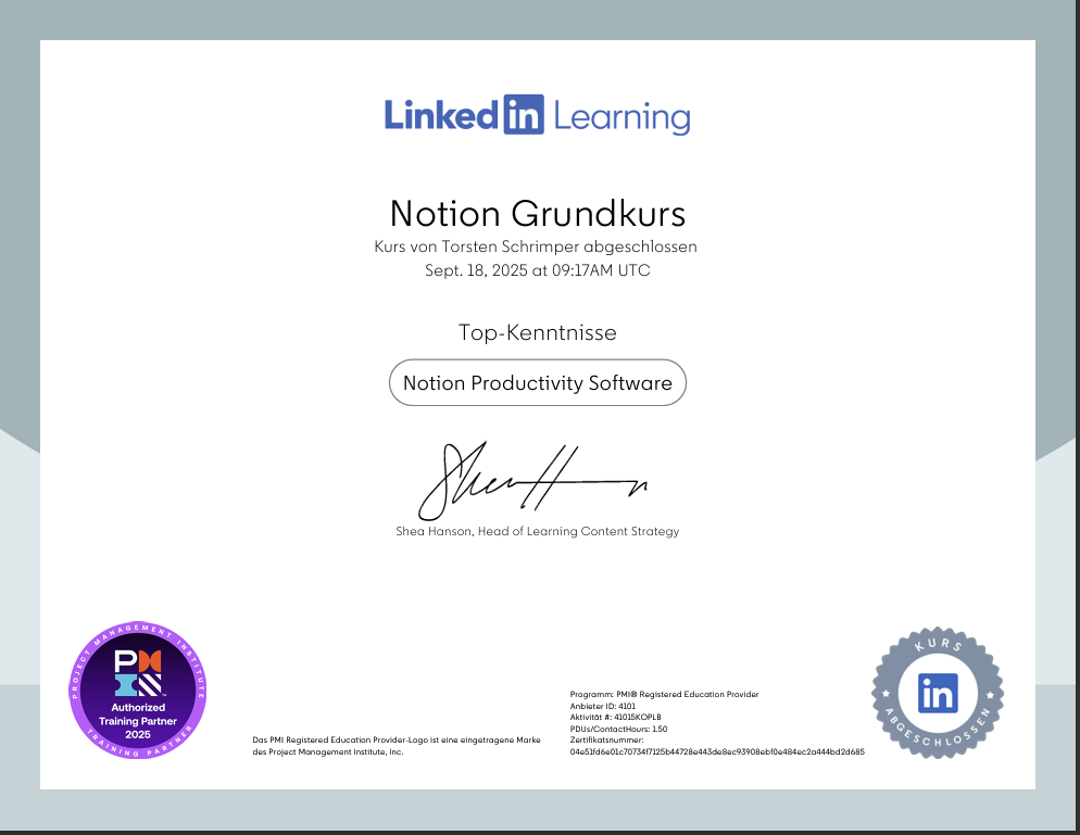 Ich glaube daran, dass lebenslanges Lernen der Schlüssel zum Erfolg ist. Aus diesem Grund habe ich mich entschieden, regelmäßig an Schulungen und Trainings teilzunehmen. Ich freue mich, meine Zertifikate von LinkedIn Learning und anderen Anbietern mit Ihnen teilen zu können. Hier finden Sie eine Übersicht meiner aktuellen Qualifikationen und Fähigkeiten, die ich durch die Teilnahme an diesen Kursen erworben habe: